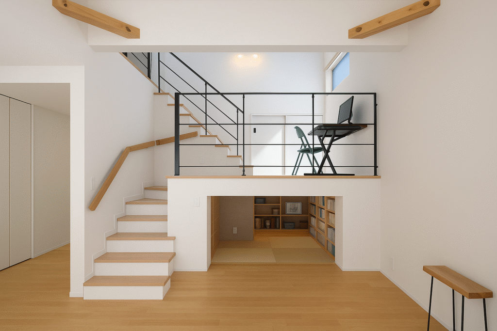 次に考えたのは、平屋とかでよく見る“1.5階”が作れるスキップフロア。厳密には階段ではなく、階段の途中に作るスペースのことですね。