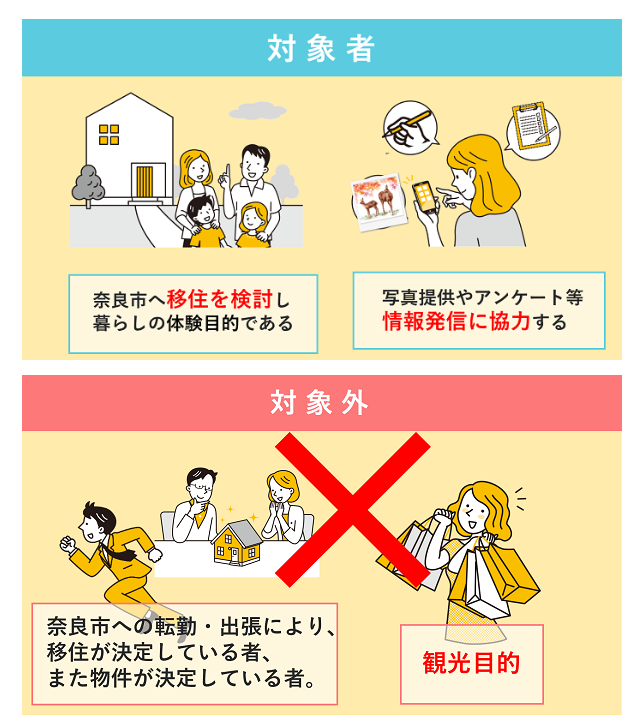 - 奈良市への移住及び定住を検討し、本市での暮らしを試験的に体験するため、本事業の登録宿泊施設に2泊以上宿泊・する方(転勤による転入予定者及び出張等を理由として事前に定められた期間移住又は定住する予定である方を除く)