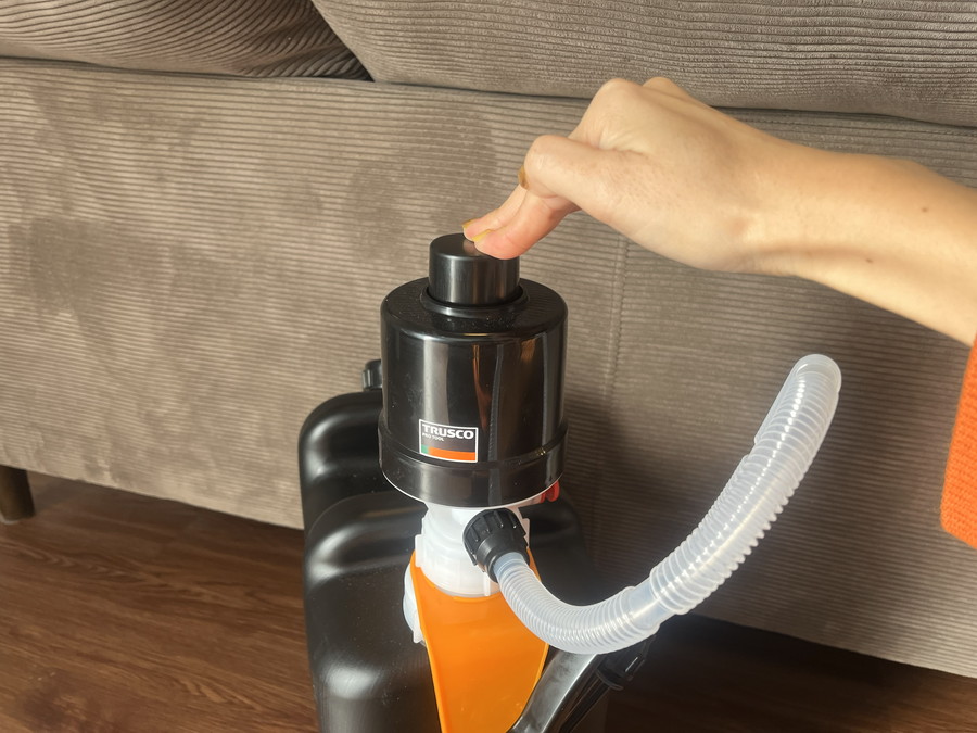 TRUSCOの給油用ポンプに替えてからは、給油後に空気抜きボタンを押すだけでチューブ内の灯油がほぼ抜け、ポンプを引き抜いても垂れない。