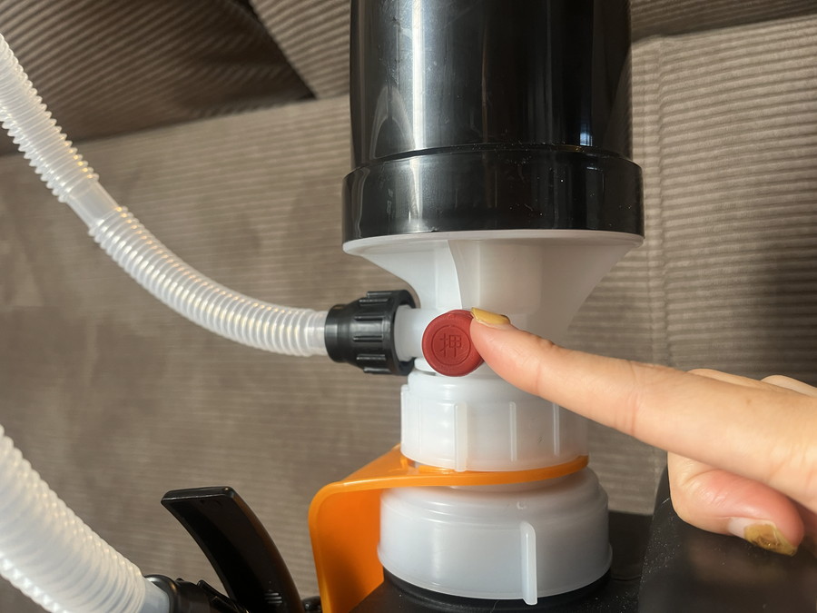 電動タイプはこのチューブ内の灯油残りが多く、ノズルホルダーの中に灯油が溜まってしまうのがストレスでしたが、今回のポンプ本体には、チューブ内の空気を抜くためのボタンがあります。これを押すことで中に残った灯油をしっかり排出、チューブ内に灯油がほぼ残らないので、収納時に垂れる心配がありませんでした。