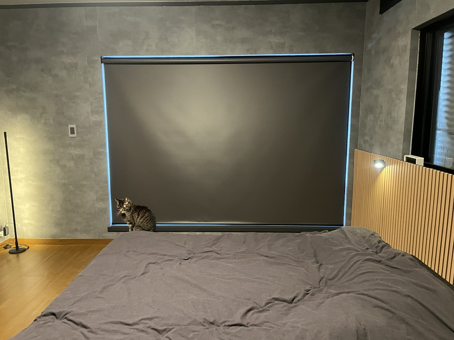 しかしロールスクリーン設置後は、自動で開閉することで朝は自然光で目覚め、夜はしっかり遮光できる環境に。毎日の開け閉めの手間もなくなり、寝室で過ごす時間の快適さが一段とアップしました!